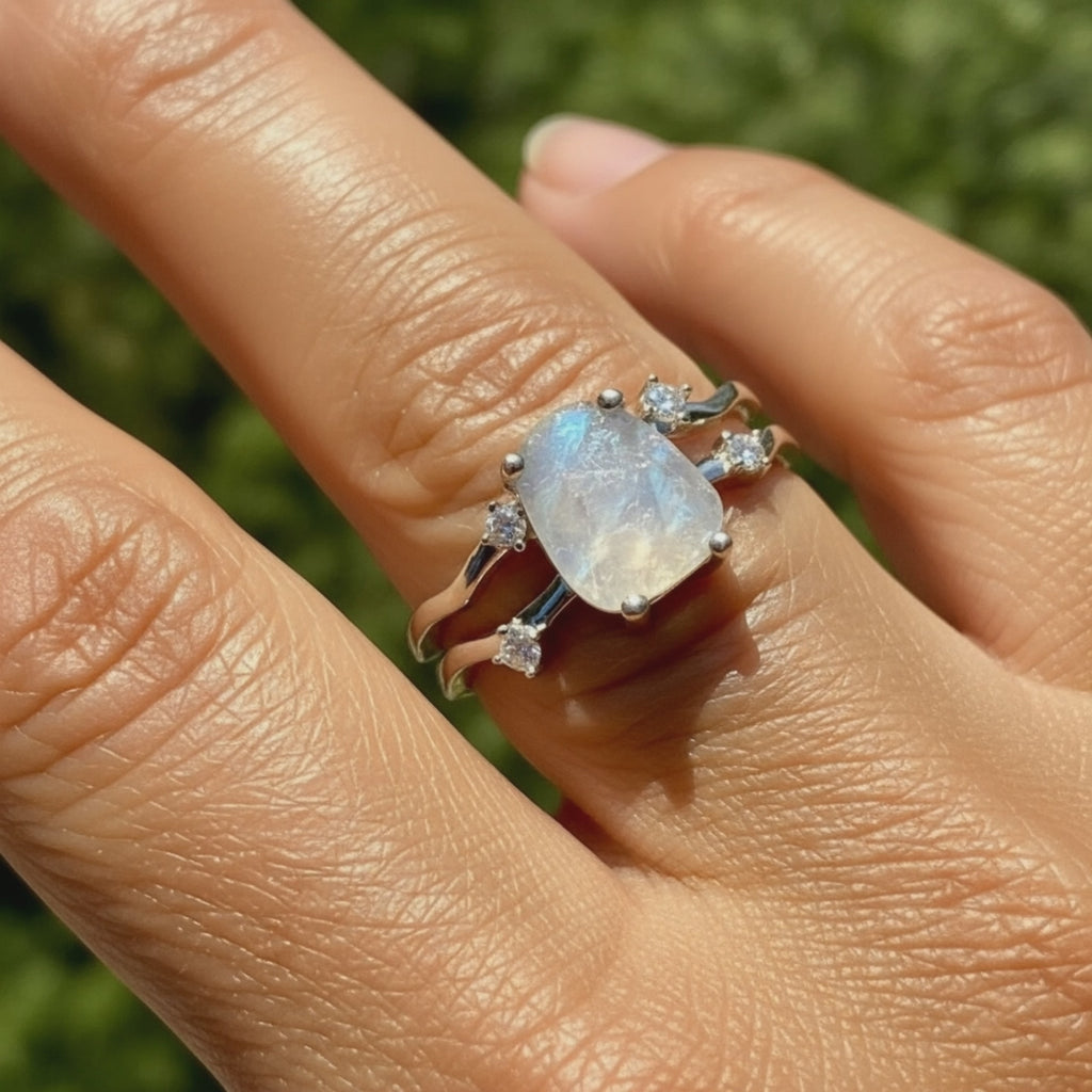 Mondstein, bekannt für seine ätherische Leuchtkraft, verkörpert Intuition, Gelassenheit und weibliche Energie. Dieses faszinierende Juwel fördert das emotionale Gleichgewicht und steigert gleichzeitig die Kreativität, während es gleichzeitig eine mystische Verbindung zu den Zyklen des Mondes hat. Seine mystische Anziehungskraft erstreckt sich auf die Fähigkeit, schillernde Lichtblitze zu erzeugen, ein schillerndes Farbspiel, das wie ein verborgenes Geheimnis aussieht, das bei bestimmten Lichtverhältnissen oder genau im richtigen Winkel gehalten wird. Dieses fesselnde Phänomen steigert seinen mystischen Charme noch weiter und fesselt den Betrachter mit einem schimmernden, irisierenden Glanz, der die geheimnisvolle Anziehungskraft des Mondes widerzuspiegeln scheint.
